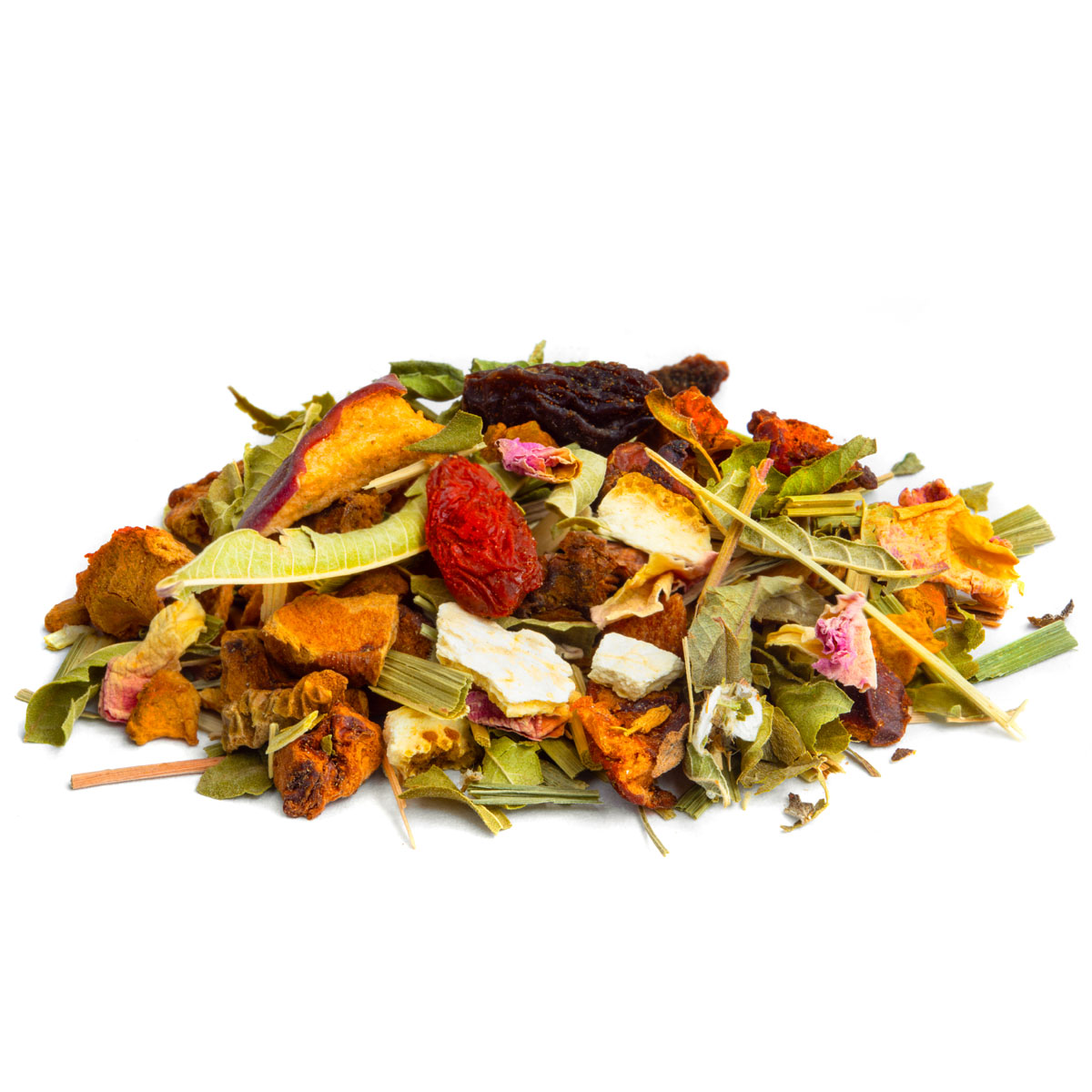 Ingrédients : Citronnelle*, gingembre*, pomme*, menthe*, coing*, carotte*, verveine entière*, morceaux de pomme*, arôme naturel de citron, arôme naturel de pamplemousse, canneberge*, mauve*, fleurs de bleuet*, Huile essentielle de citron vert*, arôme naturel de bergamote. * Issu de l‘agriculture biologique