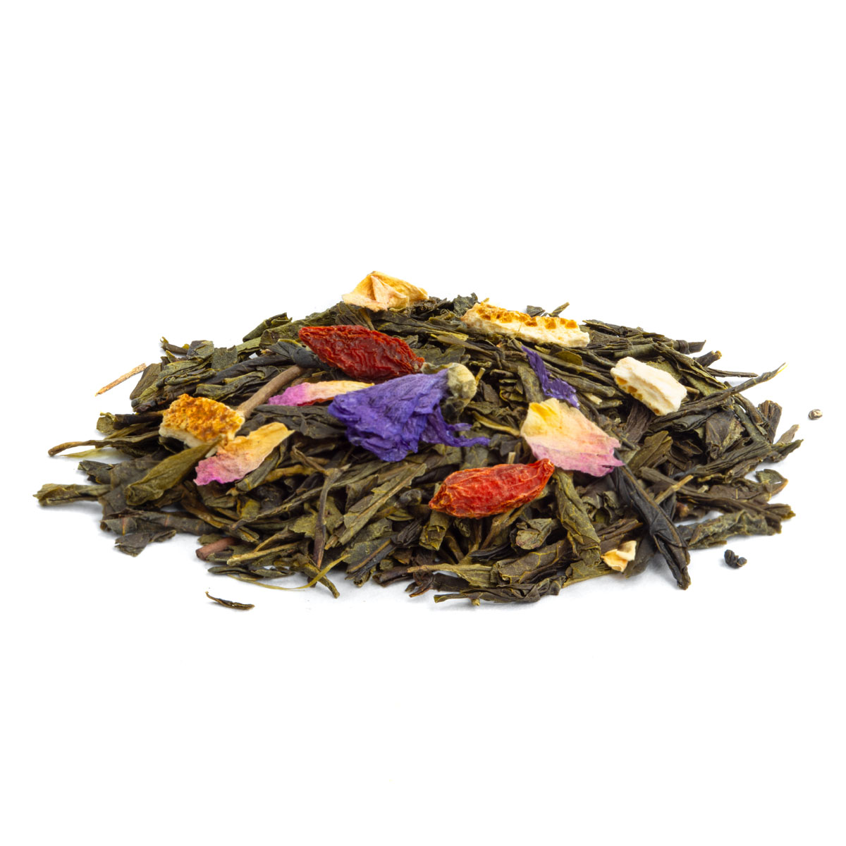 Ingrédients : Thé vert China Sencha, baie de goji (4%), arôme naturel, écorces d’orange, pétales de rose, mauve, arôme naturel d’orange.
