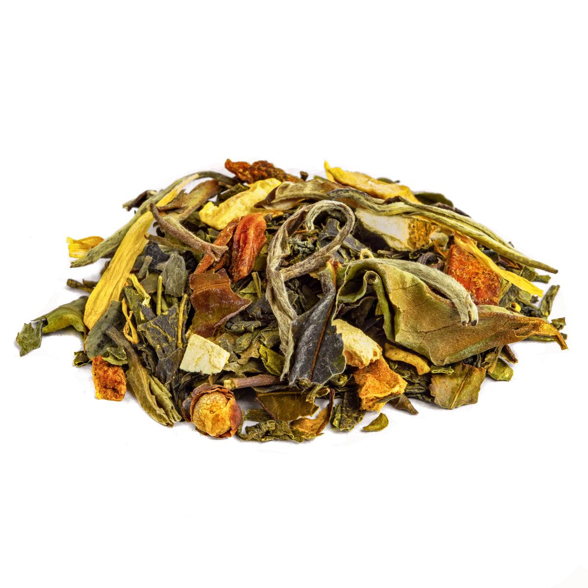 Ingrédients : Thé vert China Sencha*, thé blanc Pai Mu Tan*, écorces d’orange*, morceaux de mangue*, papaye*, arôme naturel d’orange, arôme naturel de fruit de la passion, arôme naturel de mangue, ananas*, abricot*, fleurs de souci*, Huile essentielle de citron vert*. * Issu de l‘agriculture biologique