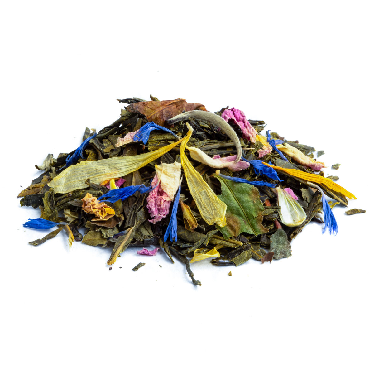 Ingrédients : Thé vert China Sencha*, thé blanc Pai Mu Tan*, arôme naturel de mangue, fleurs de souci*, pétales de rose*, arôme naturel d’orange, fleurs de bleuet*, arôme naturel de bergamote. * Issu de l‘agriculture biologique
