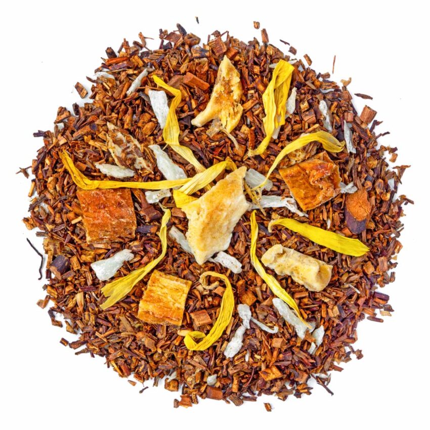 Ingrédients : Rooibos naturel*, Honeybush*, coco*, morceaux de mangue*, papaye*, arôme naturel de noix de coco, ananas*, arôme naturel de fruit de la passion, fleurs de souci*, arôme naturel d’ananas, extrait de vanille*. * Issu de l‘agriculture biologique