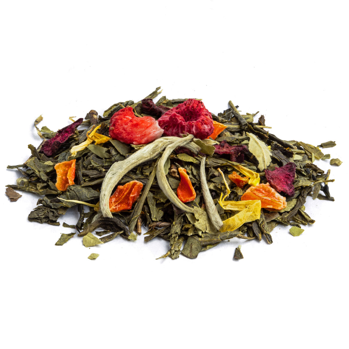 Ingrédients : Thé vert China Sencha*, thé vert Darjeeling OP*, carotte*, betterave rouge*, alchémille*, arôme naturel de fraise, China White Dragon Silverneedle*, arôme naturel de pêche, fleurs de souci*, framboise*, fraise*, arôme naturel de framboise. * Issu de l‘agriculture biologique