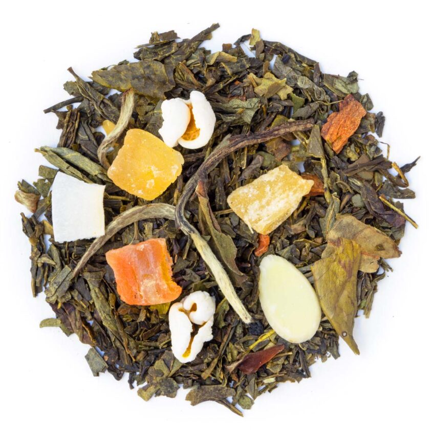 Ingrédients : Thé vert China Sencha, papaye (papaye, sucre), ananas (ananas, sucre), raisin (raisin, huile végétale), thé blanc Pai Mu Tan, coco (coco, graisse de coco, sucre), bâtons de cannelle, arôme, pop-corn, AMANDE (2%).