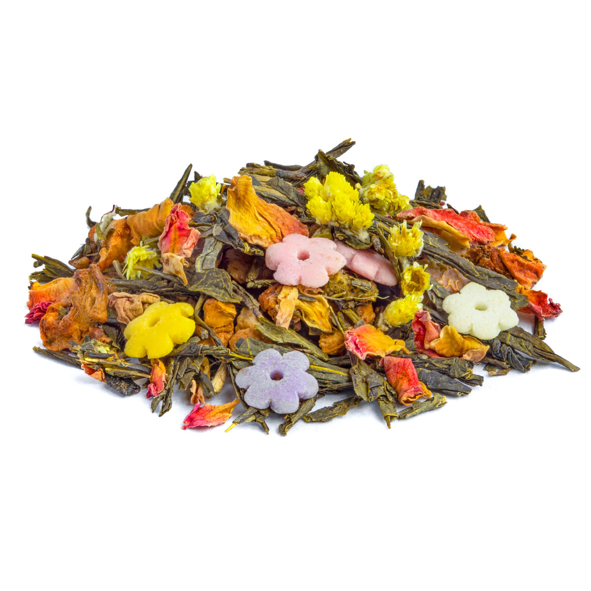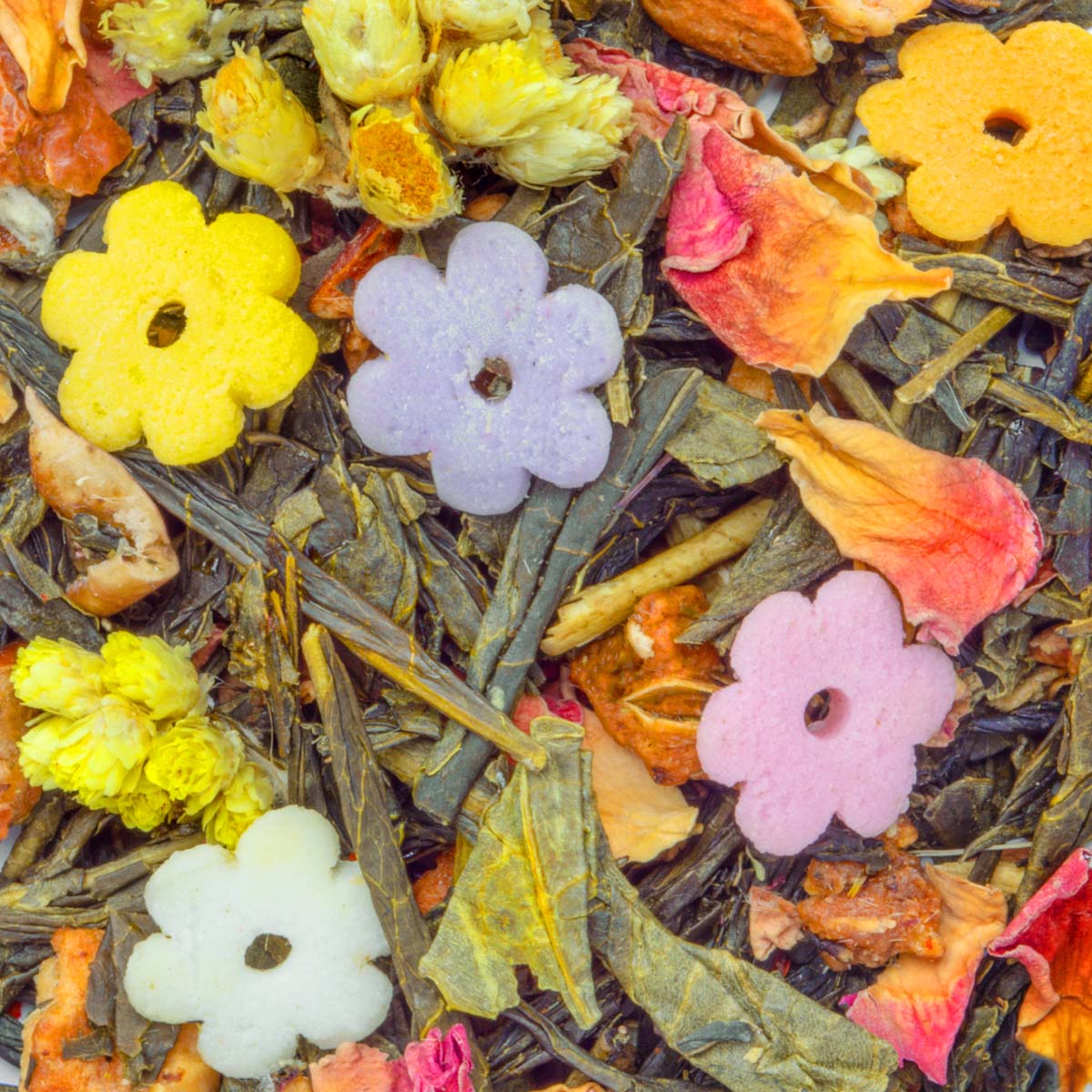 Ingrédients : Thé vert (51 %), morceaux de pomme, morceaux de pêche (pêche, farine de riz), arôme, fleurs de sucre (sucre, farine de riz, huile de riz, fécule de pomme de terre, arôme, jus de betterave concentré, colorant: curcumine, riboflavine, carmin véritable, indigotine), morceaux de pêche lyophilisée (pêche, sucre), miel de Manuka en poudre (miel de Manuka, maltodextrine), pétales de rose, pied de chat