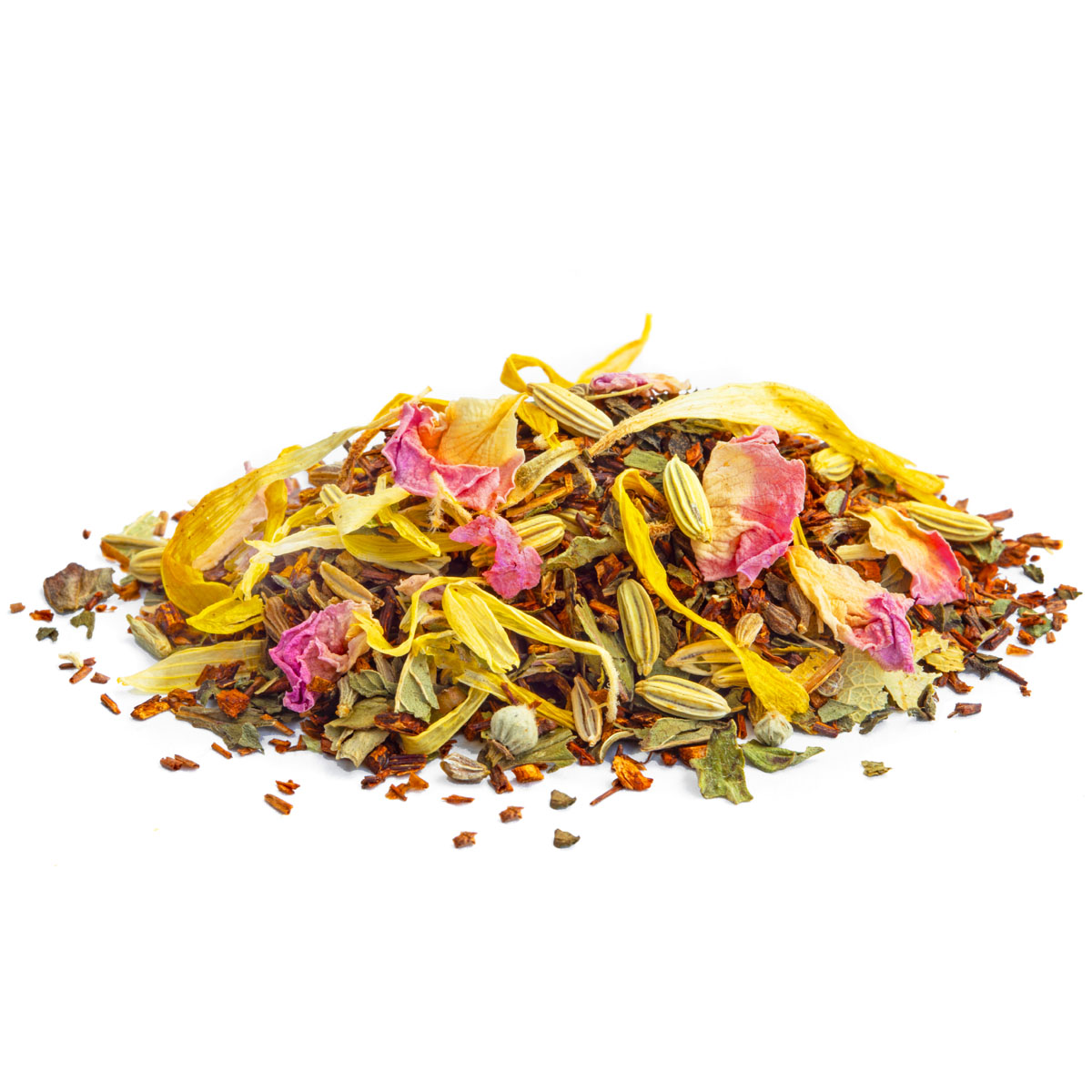 Ingrédients : Rooibos naturel*, fenouil*, anis*, menthe poivrée*, fleurs de tilleul*, arôme naturel de menthe poivrée, fleurs de souci*, pétales de rose*. * Issu de l‘agriculture biologique